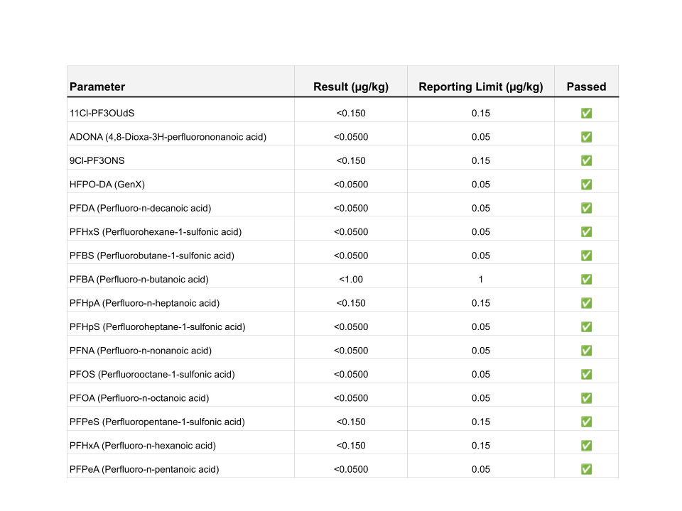 No PFAS compounds were detected above reporting limits across all tested substances, including PFOA, PFOS, PFNA, PFHxS, PFBS, and related PFAS compounds.