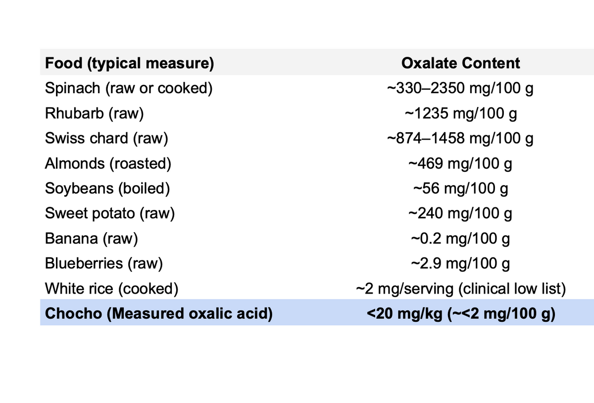 Independent laboratory analysis shows our Chocho Plant Protein contains <20 mg/kg of oxalic acid, placing it at the low end of the oxalate spectrum when compared with foods documented in scientific literature.