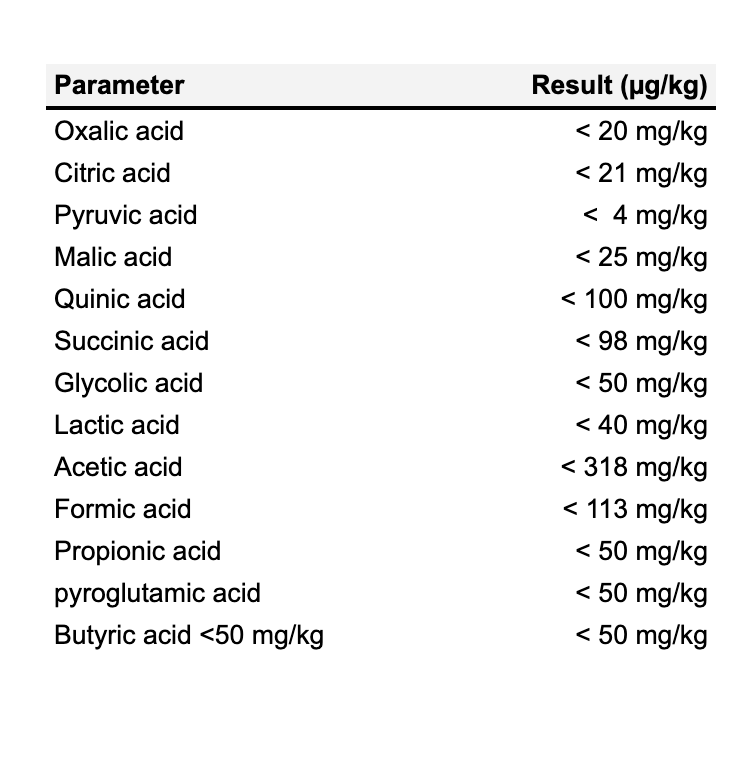 Our Chocho Plant Protein was independently tested by Eurofins Scientific, a globally recognized third-party laboratory, using an Organic Acid Profile analysis. Results per 100g raw material below.